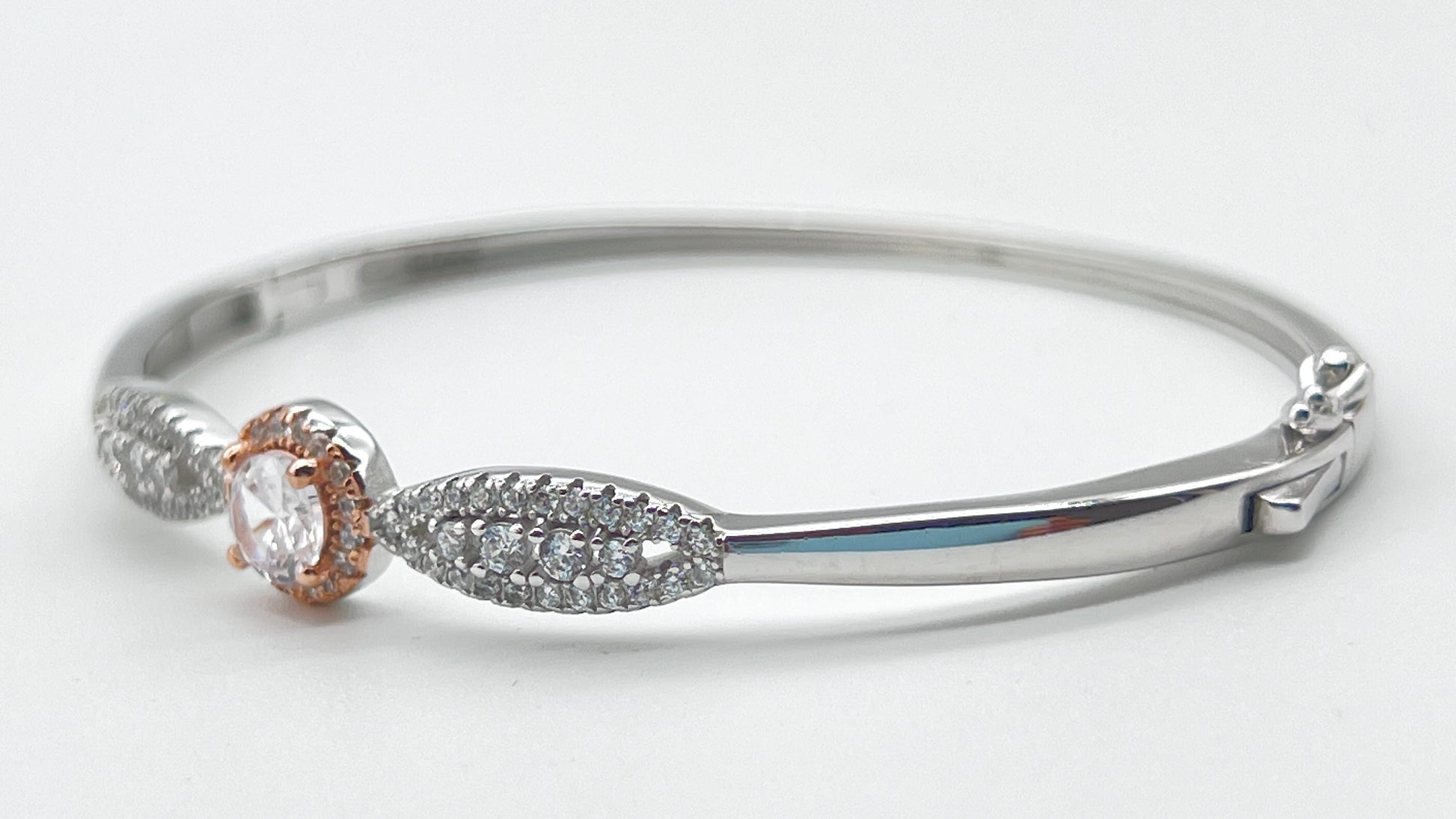 A masterpiece of subtle sophistication, this bangle showcases a dazzling round centerpiece embraced by a warm rose gold halo. The sleek sterling silver band flows into marquise-shaped clusters of shimmering stones, creating a balanced blend of elegance and sparkle. Designed in 925 sterling silver with a smooth rhodium finish, it’s lightweight, durable, and perfect for everyday glamour.