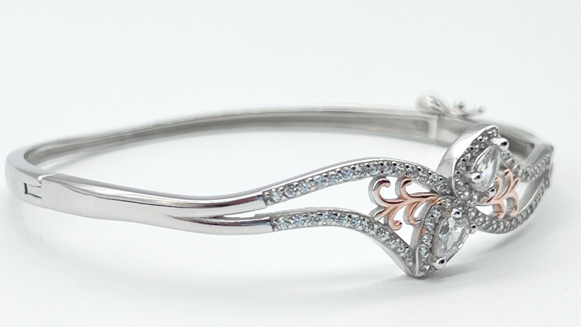 Gracefully designed in 925 sterling silver, this bangle features a captivating floral-inspired motif adorned with two pear-shaped cubic zirconia framed in micro pavé sparkle. The delicate rose gold accents add warmth and contrast, creating a stunning two-tone effect. Perfect for special occasions or adding refined beauty to your daily look.