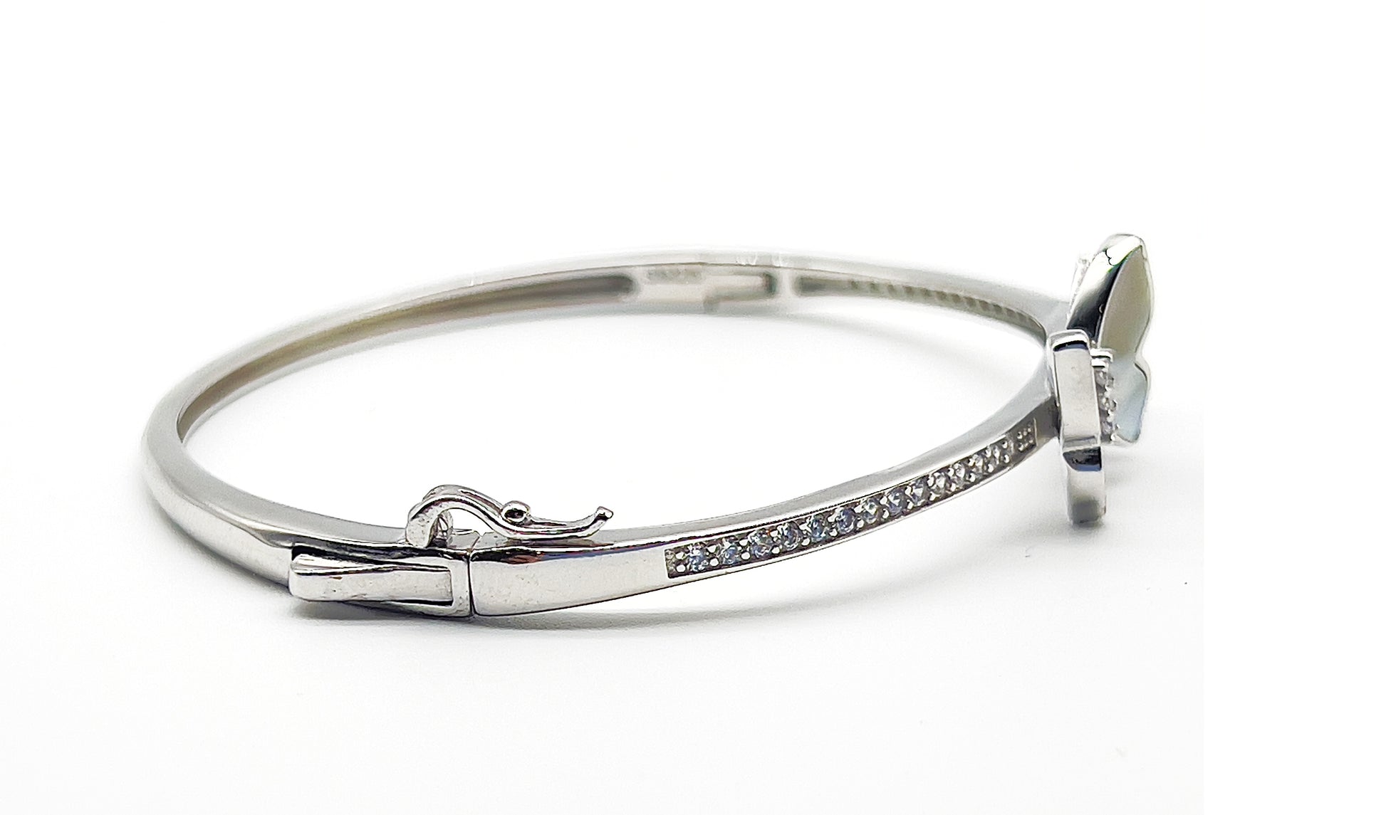 Delicately designed in 925 sterling silver βͺ, this bangle showcases a graceful butterfly motif π¦ adorned with shimmering Mother of Pearl π and radiant American diamonds π. A timeless symbol of lightness and charm, perfect for everyday elegance