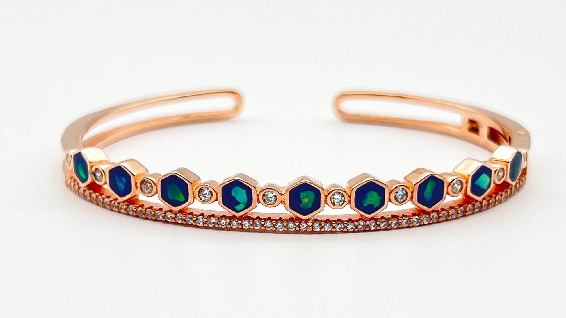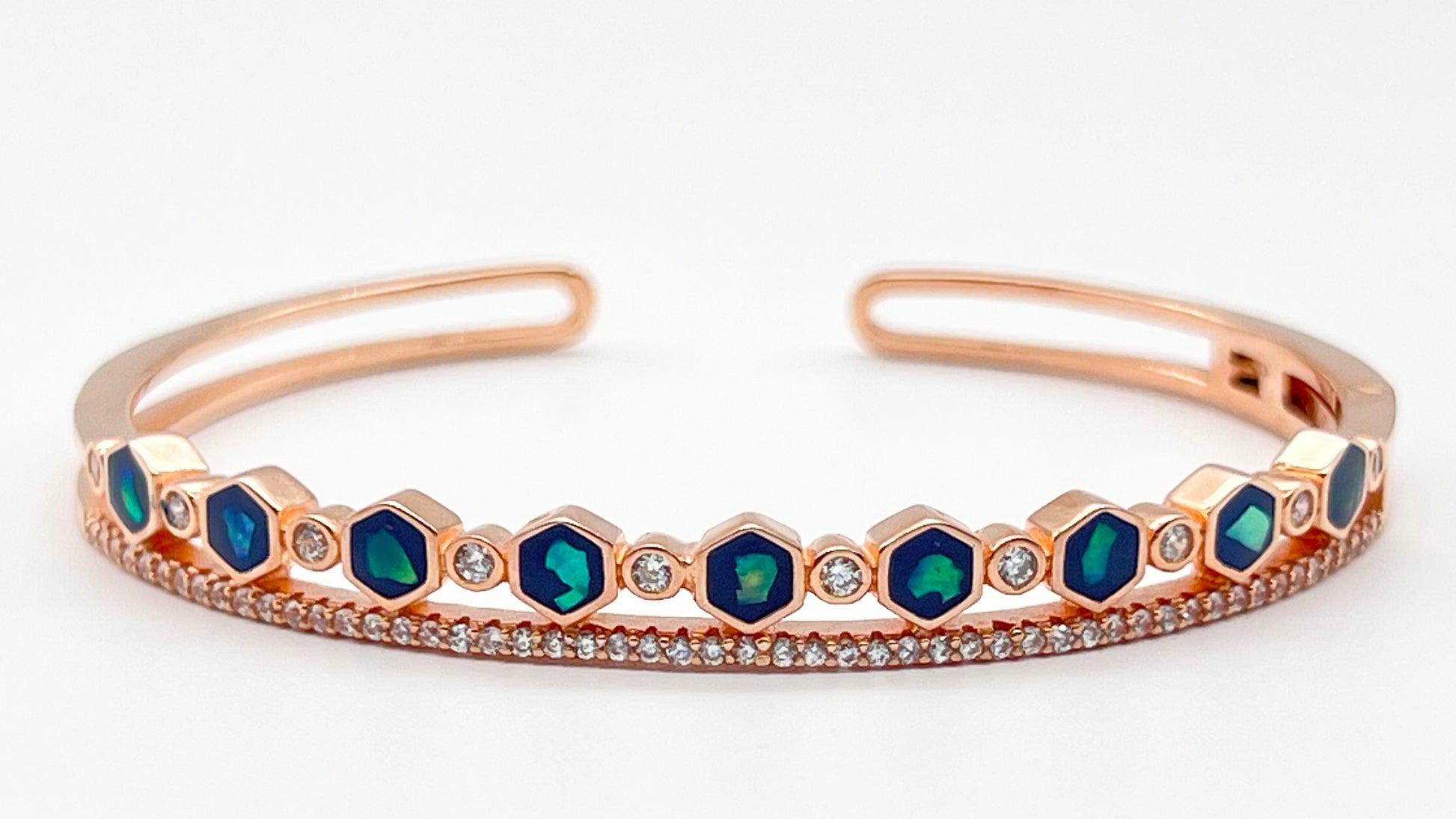 Turn heads with this chic and contemporary bangle, featuring a striking row of hexagon-cut blue-green opal stones accented with sparkling cubic zirconia. The warm rose gold plating enhances the vivid gemstone hues, while the sleek open cuff design ensures a comfortable, adjustable fit. A second row of pavΓ©-set CZ stones adds an extra touch of brilliance, making this piece perfect for both everyday glamour and special occasions.