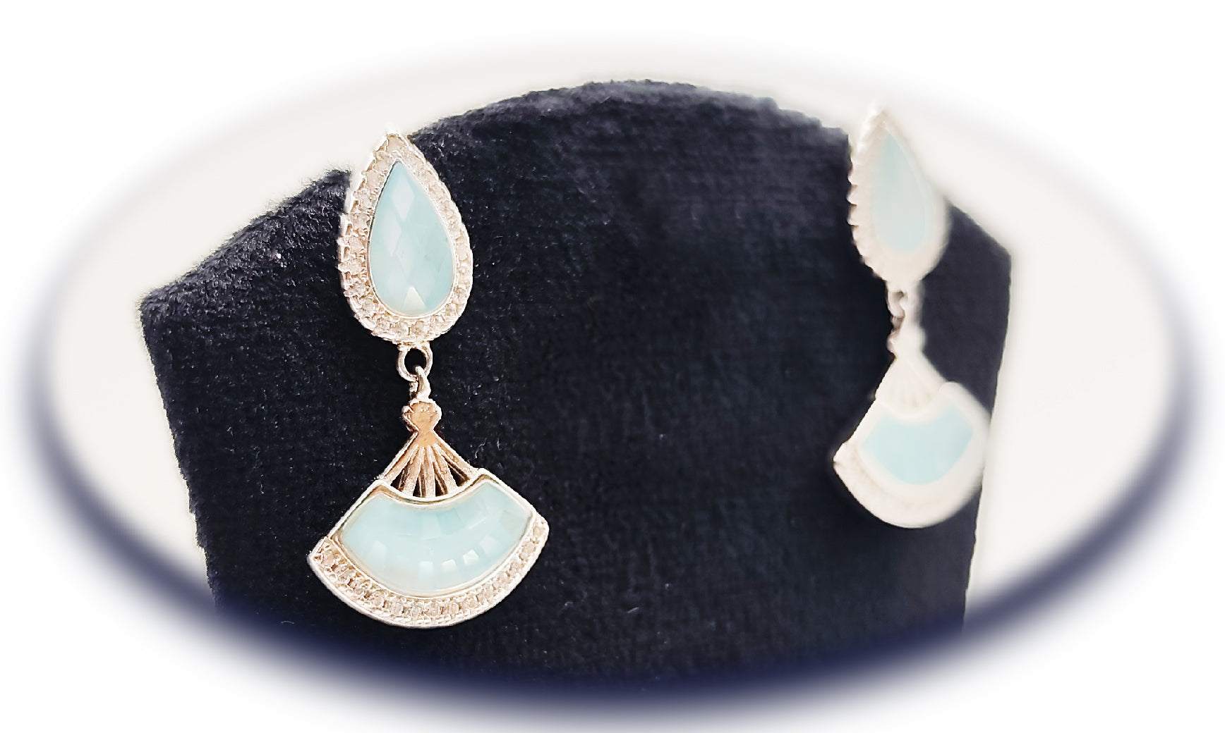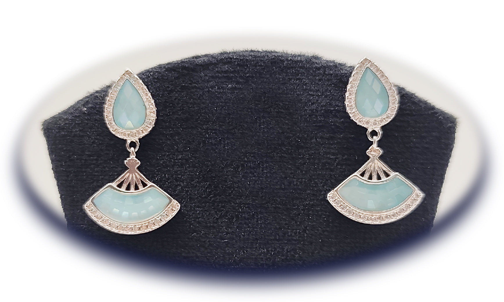 Β A refined pear drop & fan motif adorned with radiant light blue Mother of Pearl. Symbolizing purity and serenity, crafted for timeless Italian elegance